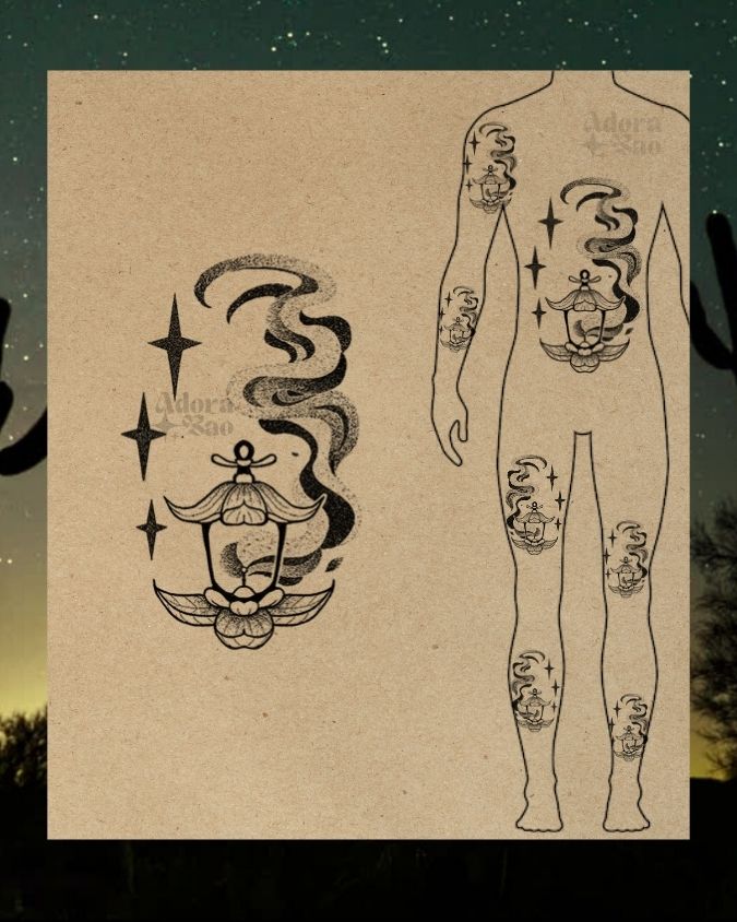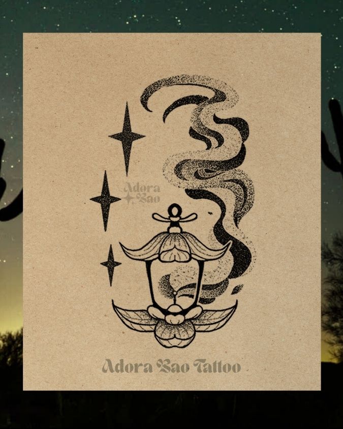 This sacred lantern tattoo represents illumination in dark seasons. The lantern sits anchored by a lotus base, with smoke rising upward toward surrounding stars.