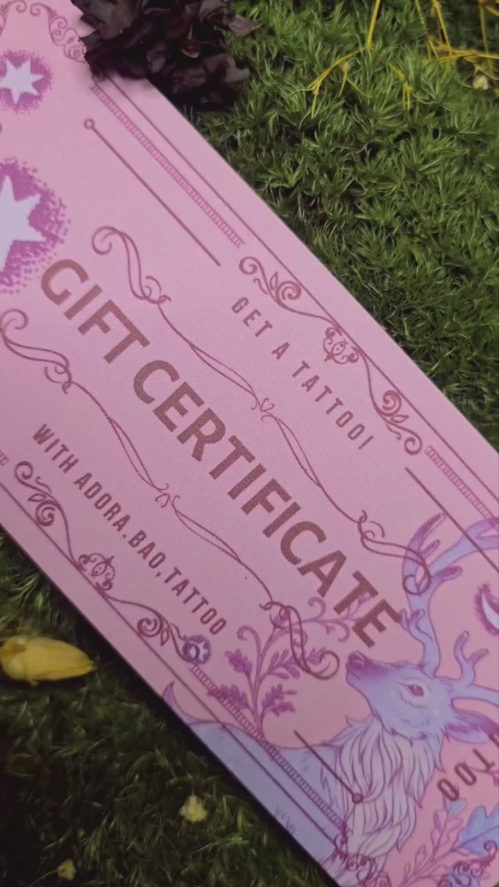 - Physical certificates are for presentation only. If you'd like one, they are available for pickup in the tattoo studio. Please reach out to me to schedule a pickup: book.adorabao@gmail.com