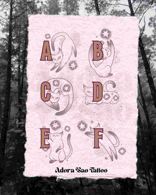 Celestial Cat Collection is a set of repeatable tattoo flash designed for clients who love whimsical, stylized feline motifs. Each piece is intentionally simple, clean, and sized to fit beautifully at three to four inches, making them quick, efficient tattoos that hold strong visual impact.