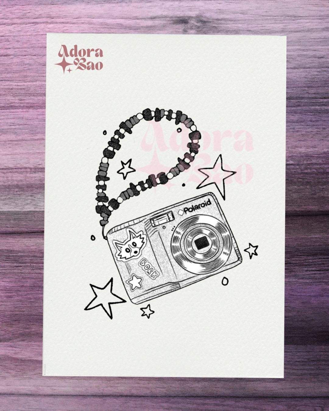 This black and grey illustrative tattoo design features a Y2K inspired digital camera with playful star accents, capturing nostalgia, creativity, and the joy of documenting life as it happens. Designed by tattoo artist Adora Bao in Metro Detroit, Michigan, this piece blends soft linework with a lighthearted, modern blackwork style. Perfect for photography lovers, creatives, and anyone drawn to early 2000s aesthetics.